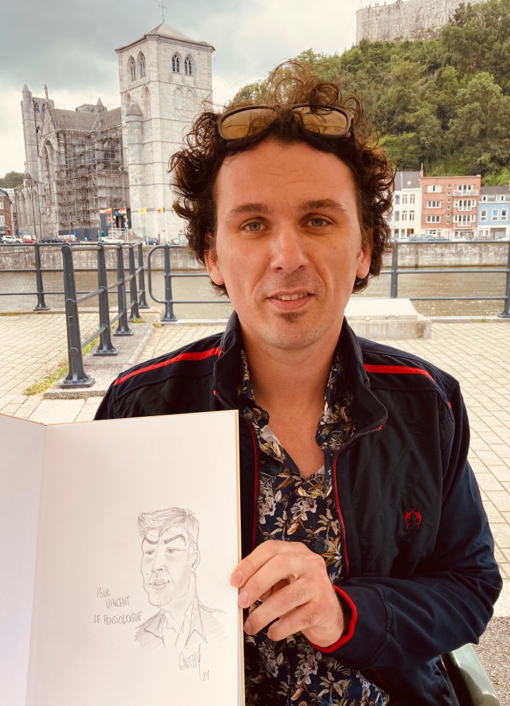 Diantre! Il faut que je le rencontre… Mais le temps passe, les circonstances et évènements de vie se succèdent, phagocytant mon esprit et ce n’est que le 31 juillet 2021 que je vois un post Facebook signalant la présence de Gauthy en dédicace aux « Bouquinistes », avenue de Batta à Huy, le dimanche 1er août 2021.