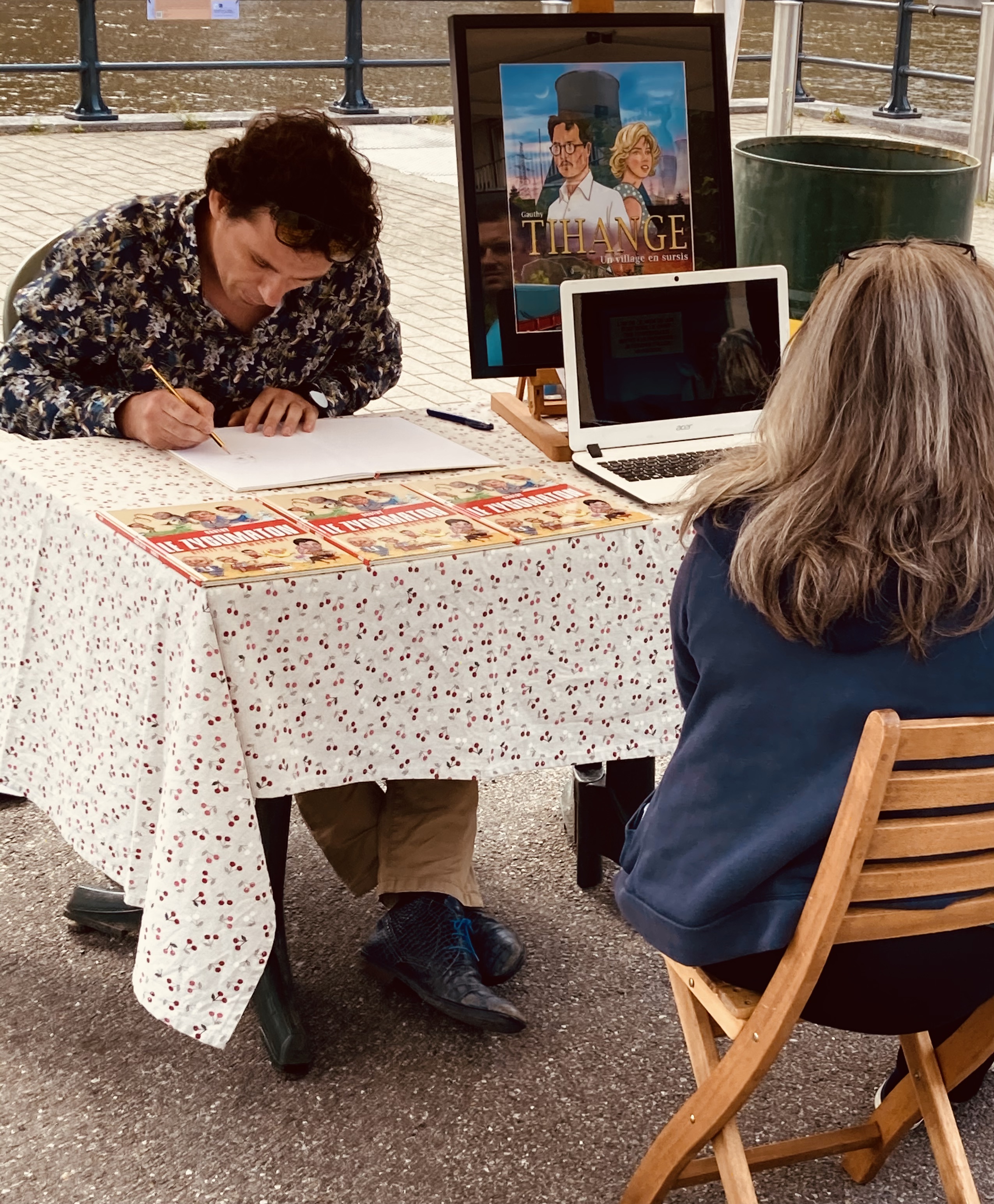 Diantre! Il faut que je le rencontre… Mais le temps passe, les circonstances et évènements de vie se succèdent, phagocytant mon esprit et ce n’est que le 31 juillet 2021 que je vois un post Facebook signalant la présence de Gauthy en dédicace aux « Bouquinistes », avenue de Batta à Huy, le dimanche 1er août 2021.