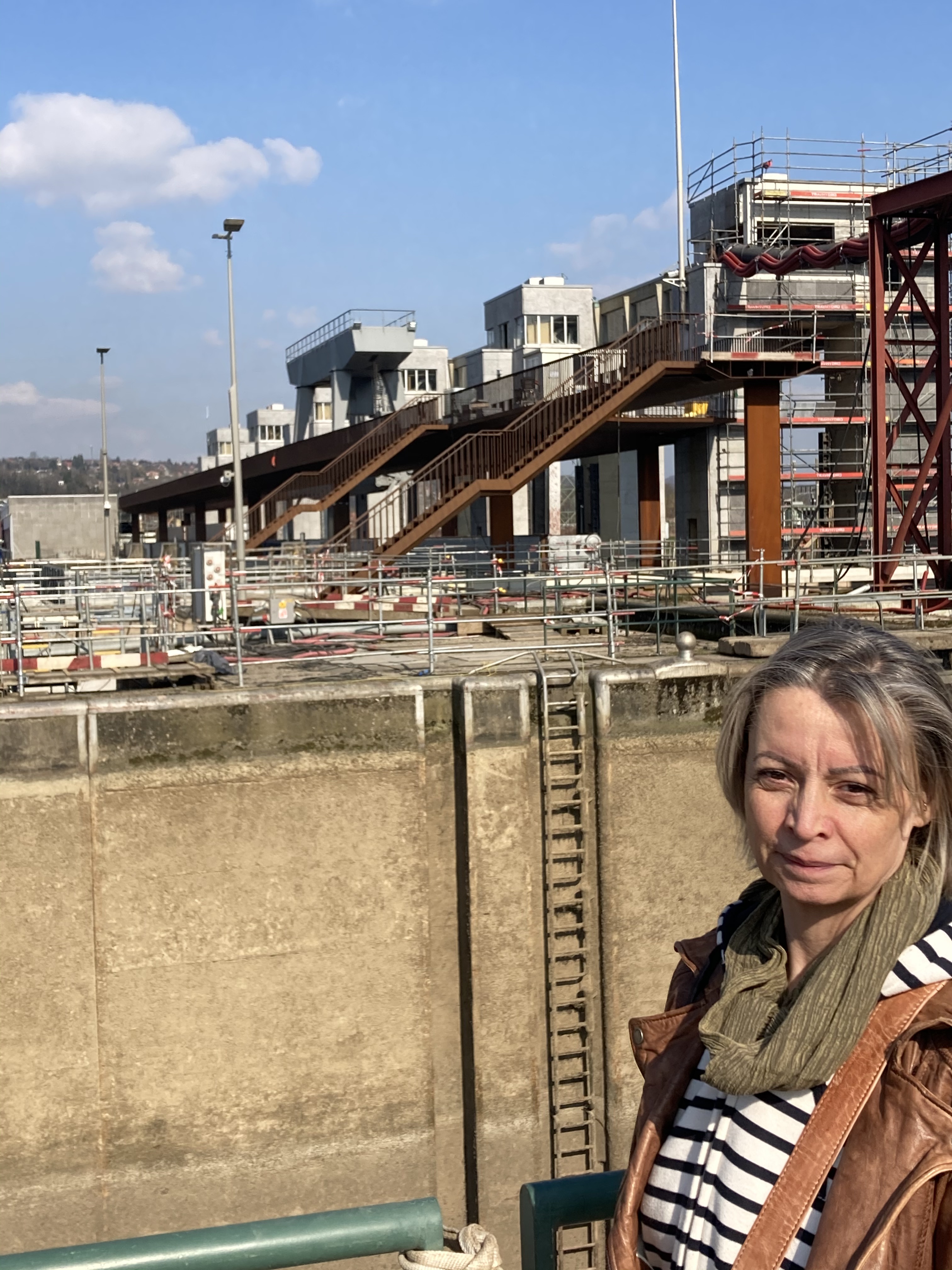 Des personnes travaillent (comme beaucoup) dans l’ombre, et leur intervention humaine n’est pas totalement remplacée par l’automatisation. Les éclusiers, en l’occurrence, les ouvriers et ingénieurs qui élaborent et réalisent ces travaux de grande ampleur, oeuvrent quasi à notre insu pour que circulent les bateaux, les péniches commerciales, et que s’écoulent les eaux du fleuve dont les tumultes réguliers érodent lentement le béton…
