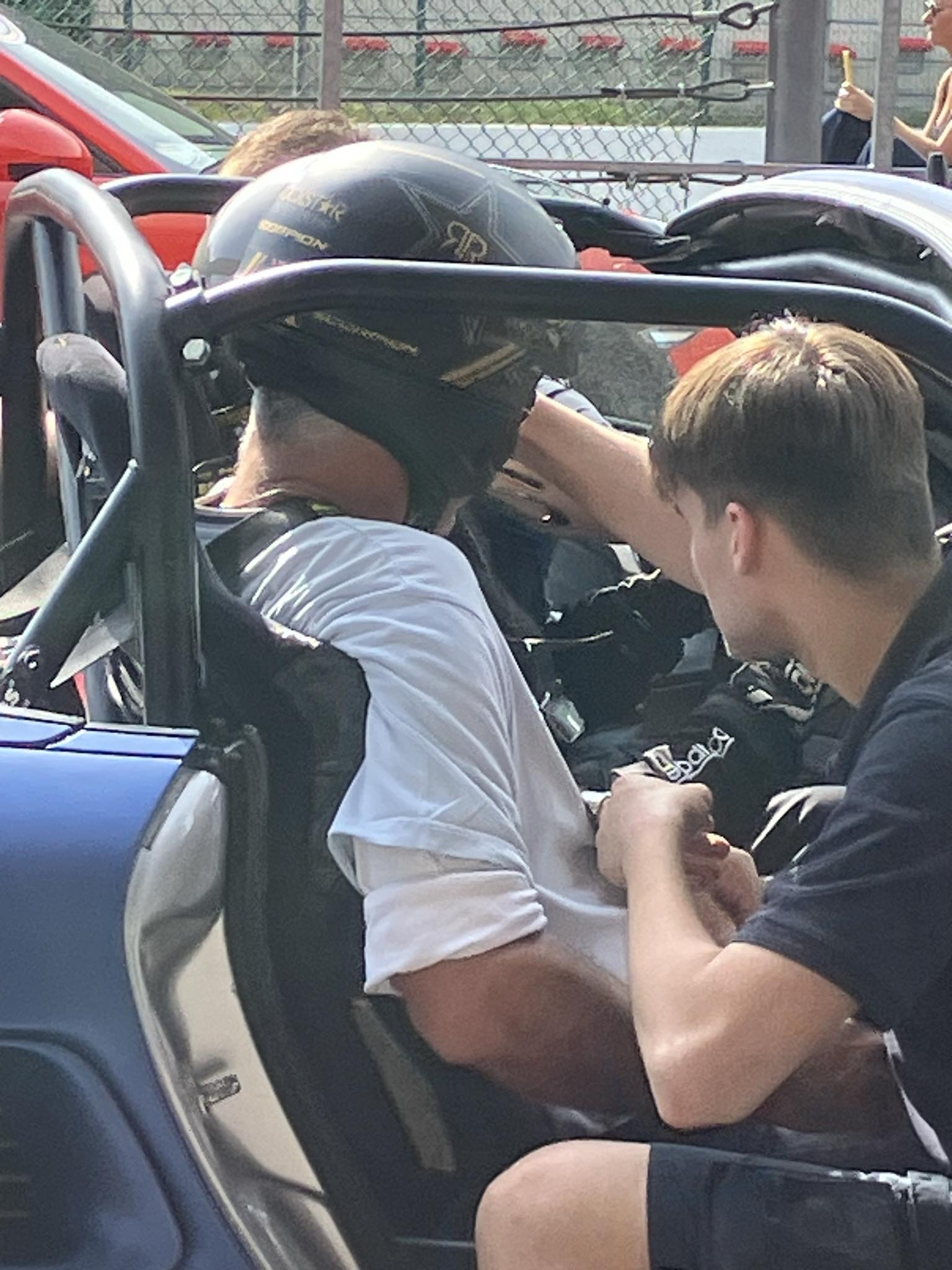 Vu ma taille (1,95 mètre) et mes 100 bons kilos, s’installer dans le baquet de la Porsche Boxter bleue est déjà un exploit! On m’arrime avec la ceinture 4 points de sécurité, casque sur le crâne (merci Pax). Chris’ me « checke », ready set go!
