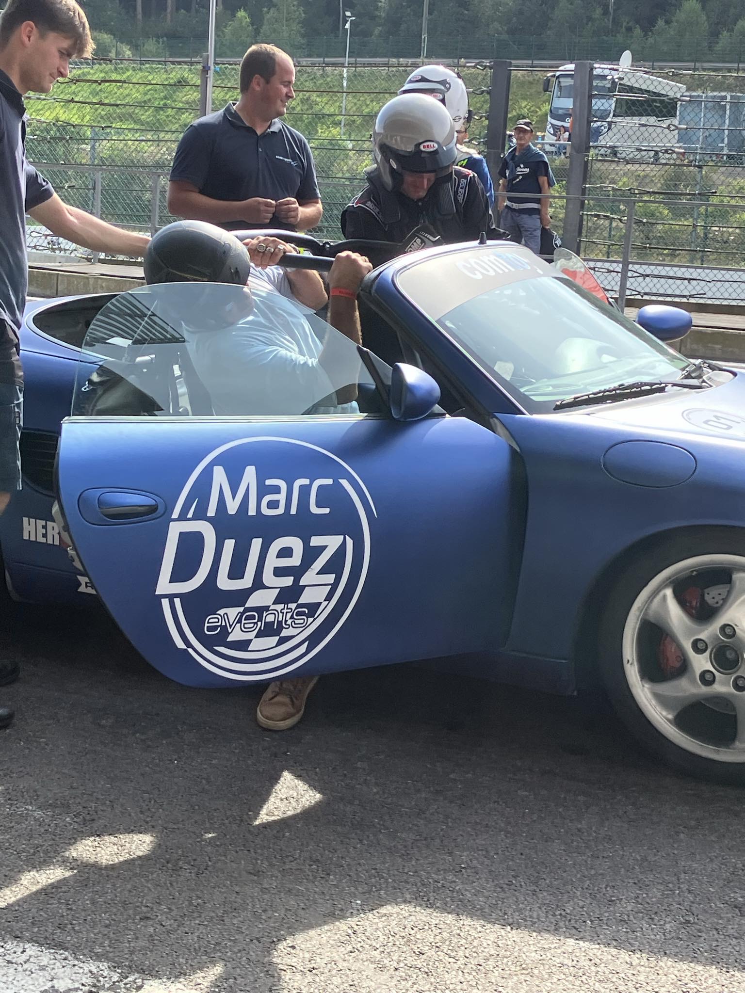 Attendant mon tour pour embarquer dans la Porsche Boxter du « MD Events Team », muni de mon bracelet rouge « Co-Driver » délivré par la très sympathique et accueillante soeur de Marc Duez, nous profitons de la vue imprenable sur le circuit depuis la terrasse surplombant le « paddock ».