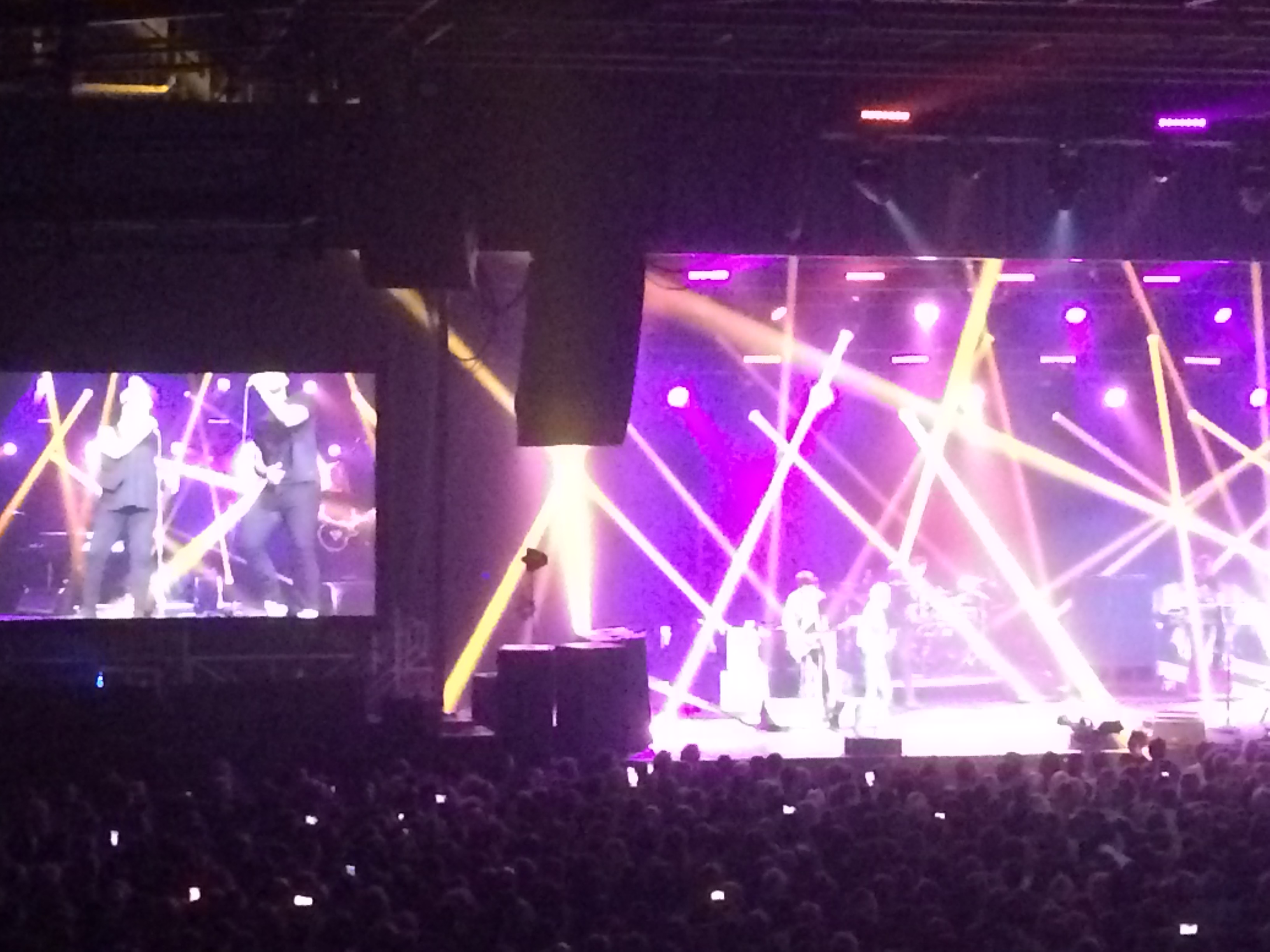 « The shape of my heart » me noue la gorge d’émotion, au point que j’en ai oublié l’inconfort de nos sièges étriqués… La majorité de nos compagnons de gradin chante en coeur. Une union sacrée opère, une émotion collégiale envahit les quelques milliers de fans dont la moyenne d’âge est variable mais avoisine les quarante ans, sans doute…
