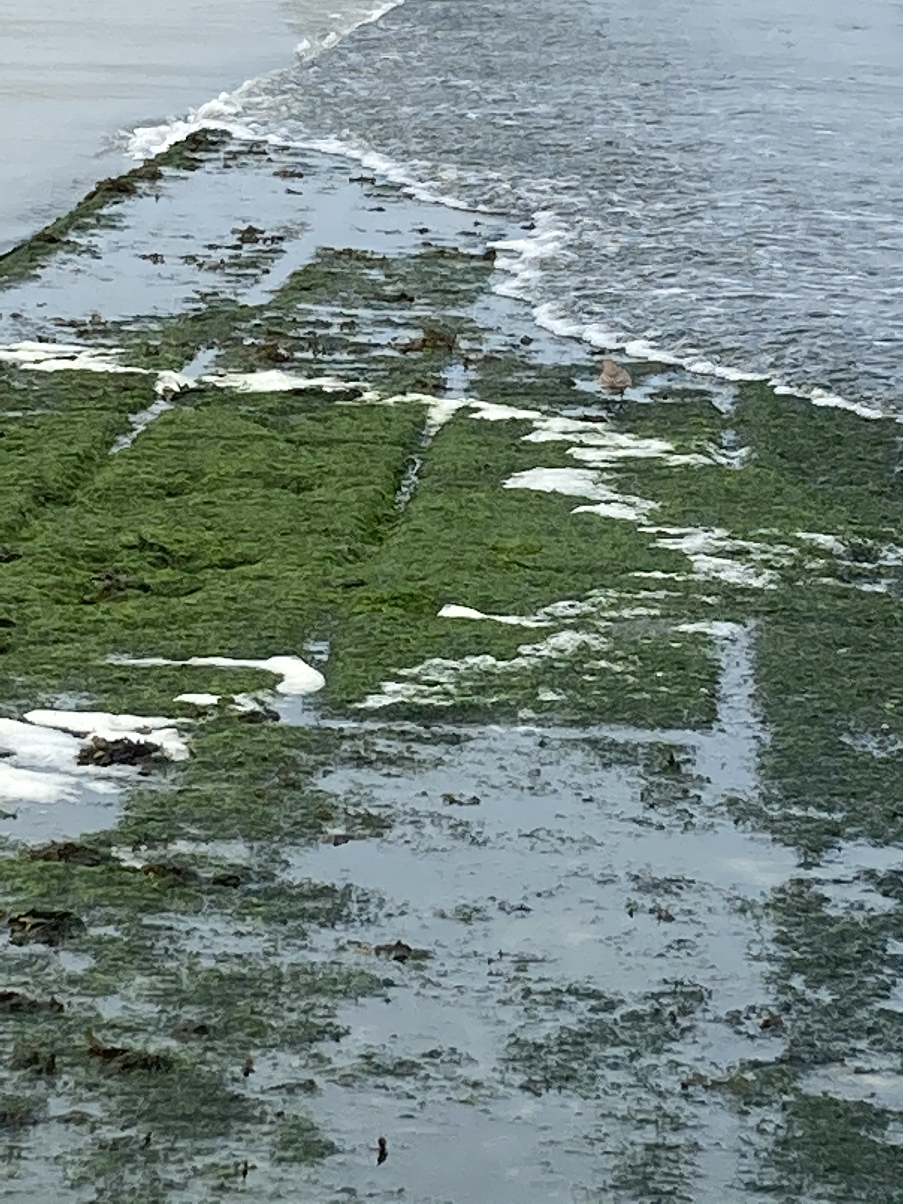 Le lendemain matin, « de Kust » nous exhibe son estran de tout son soûl… Nous marchons à marée basse, Laurence les pieds dans l’eau fraîche… La plage s’est entièrement dénudée de son manteau aqueux et salé, découvrant quelques mollusques échoués, sous nos yeux médusés… Les brise-lames couverts de mousse verdâtre ont quitté leur « apnée » cyclique… Les oiseaux se repaissent de ce que leur offre ce biotope particulier vivant grâce au marnage…