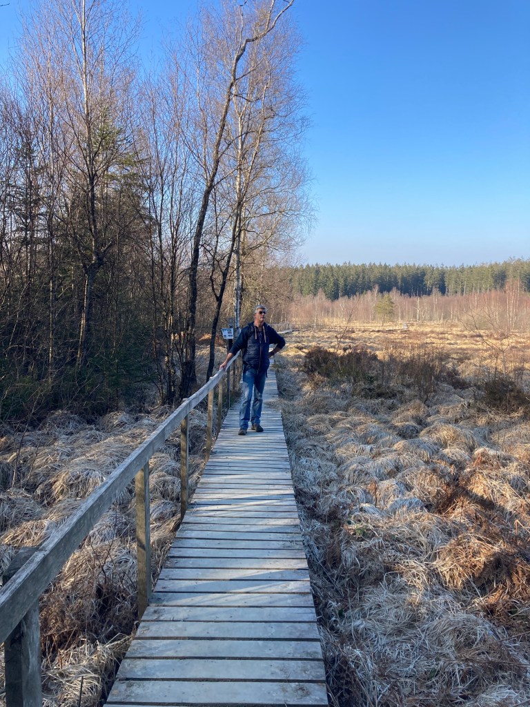 La « Fange de l’Abîme » est aménagée de caillebotis en parfait état. On se croirait dans les Fagnes… Un panneau nous indique que nous effectuons une incursion sur le territoire Français, par où, cinquante ans plus tôt, on passait pour éviter de payer les taxes…