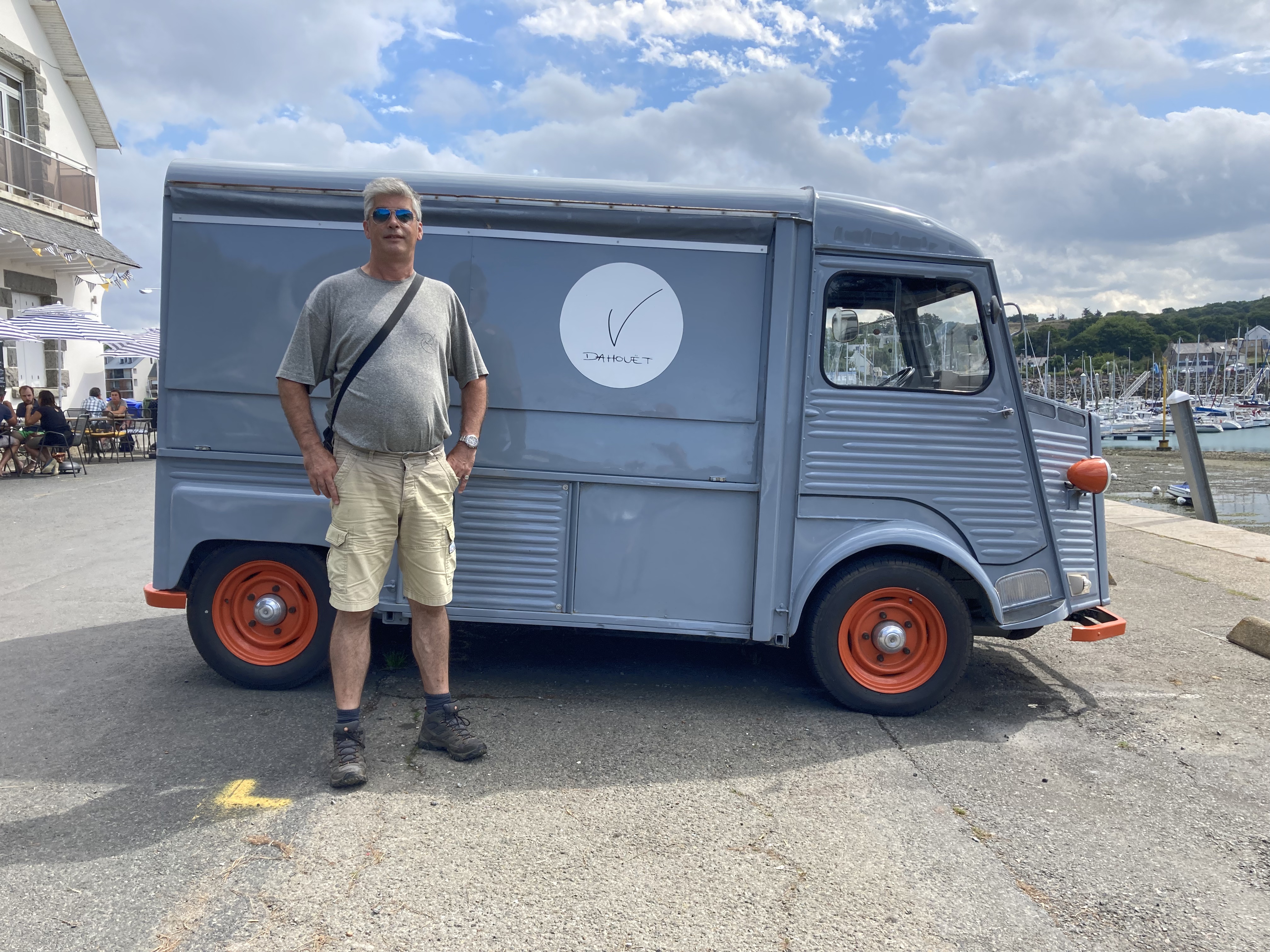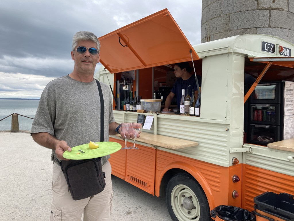 Laurence m’explique les moeurs locales en la matière et nous acquérons notre plateau d’huitres à emporter sur le petit marché, plateau nécessairement accompagné d’un verre de vin blanc qui nous est servi à « La Quille », une estafette « Citroën » d’un autre âge (1970) qui fait office de bar à vins…