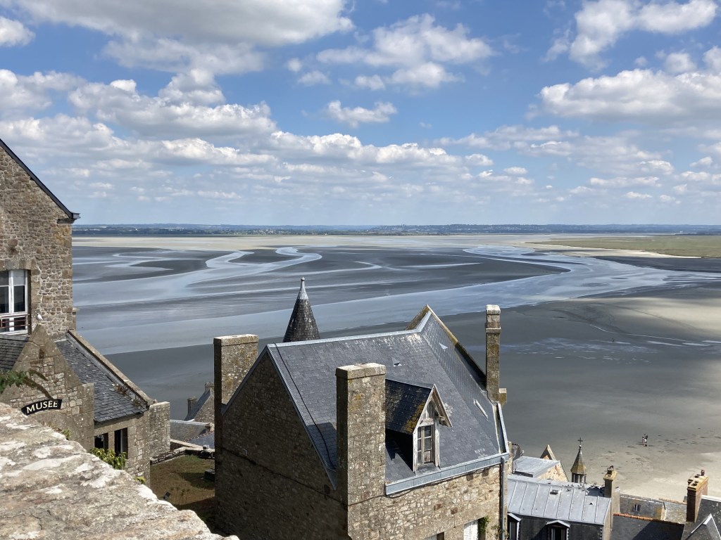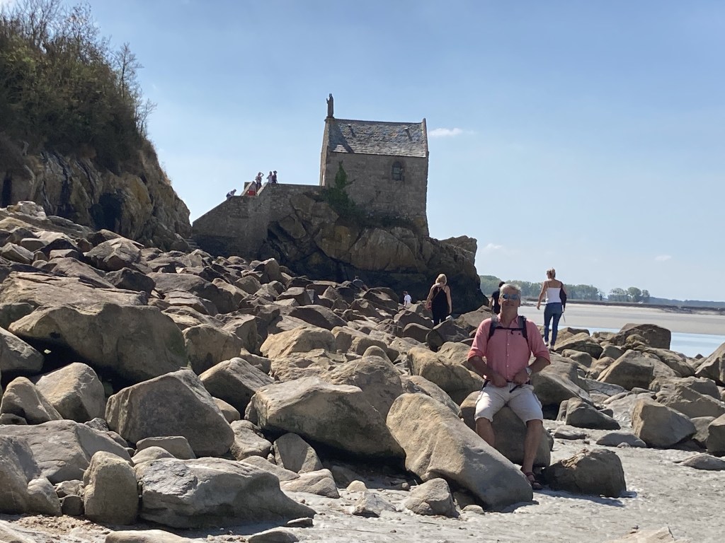 Nous choisissons de parcourir les 2800 mètres qui nous séparent du fameux énorme rocher de 960 mètres de circonférence, 92 mètres d’altitude (150 mètres à la flèche de la statue de St-Michel) et 7 hectares de superficie émergée, hébergeant depuis le début du huitième siècle un village auquel culminera plus tard une Abbaye…