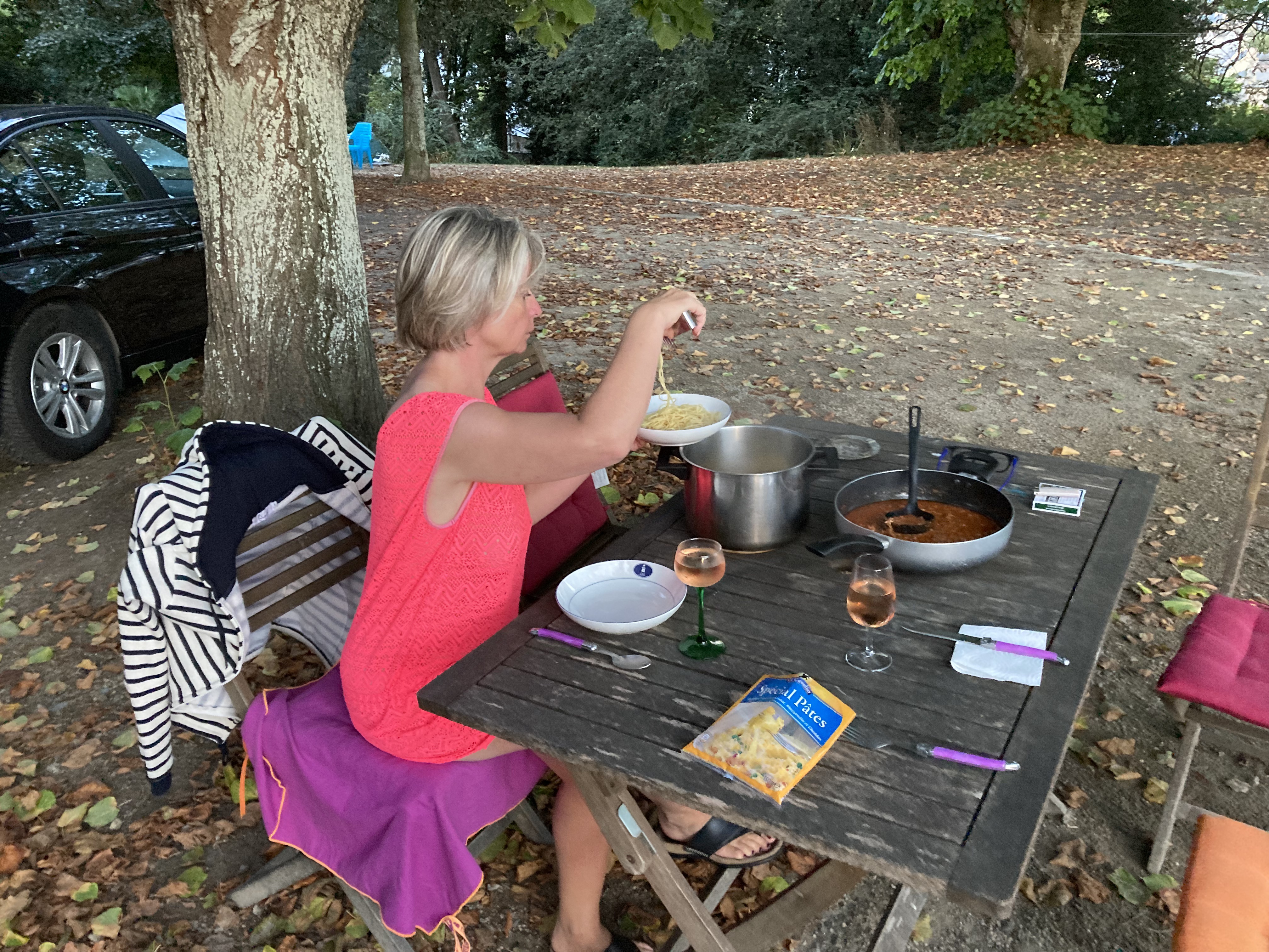 Ce soir, ce sera un bon « spaghaâr » maison, accompagné du sempiternel verre de vin rosé siroté à la table extérieure en bois de notre logement, d’où l’on peut voir le soleil se coucher sur une très belle journée bretonne, non sans piquer une tête dans la piscine… Off course…
