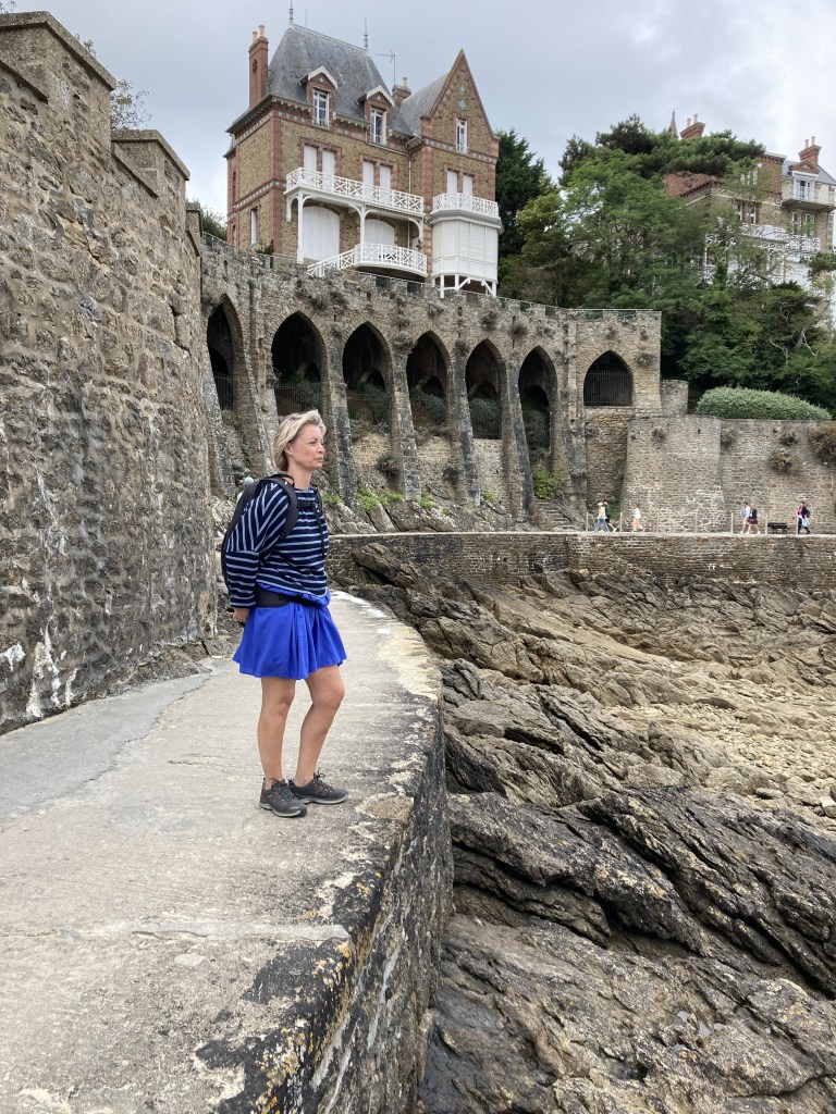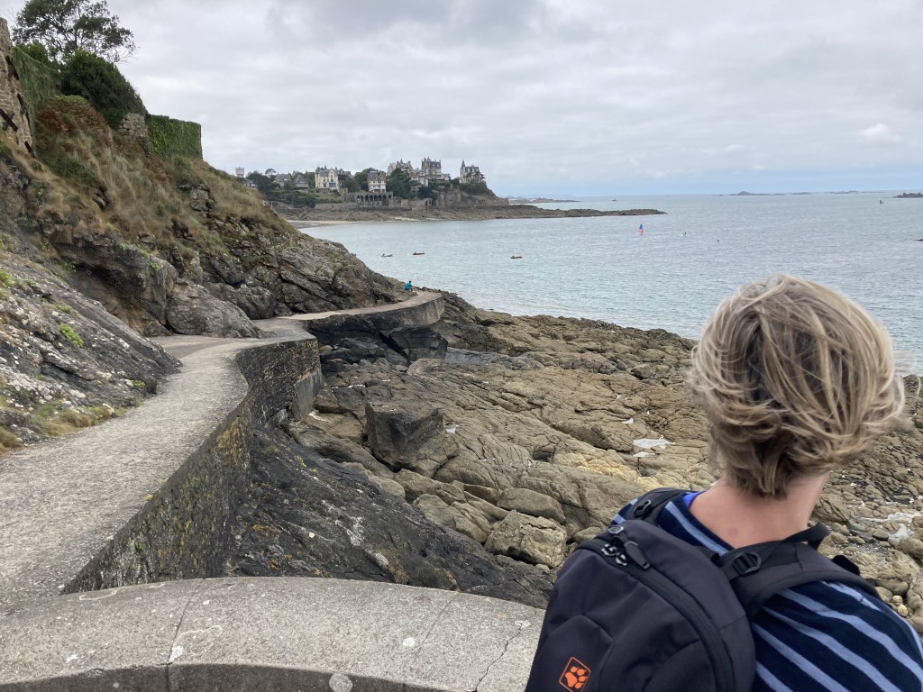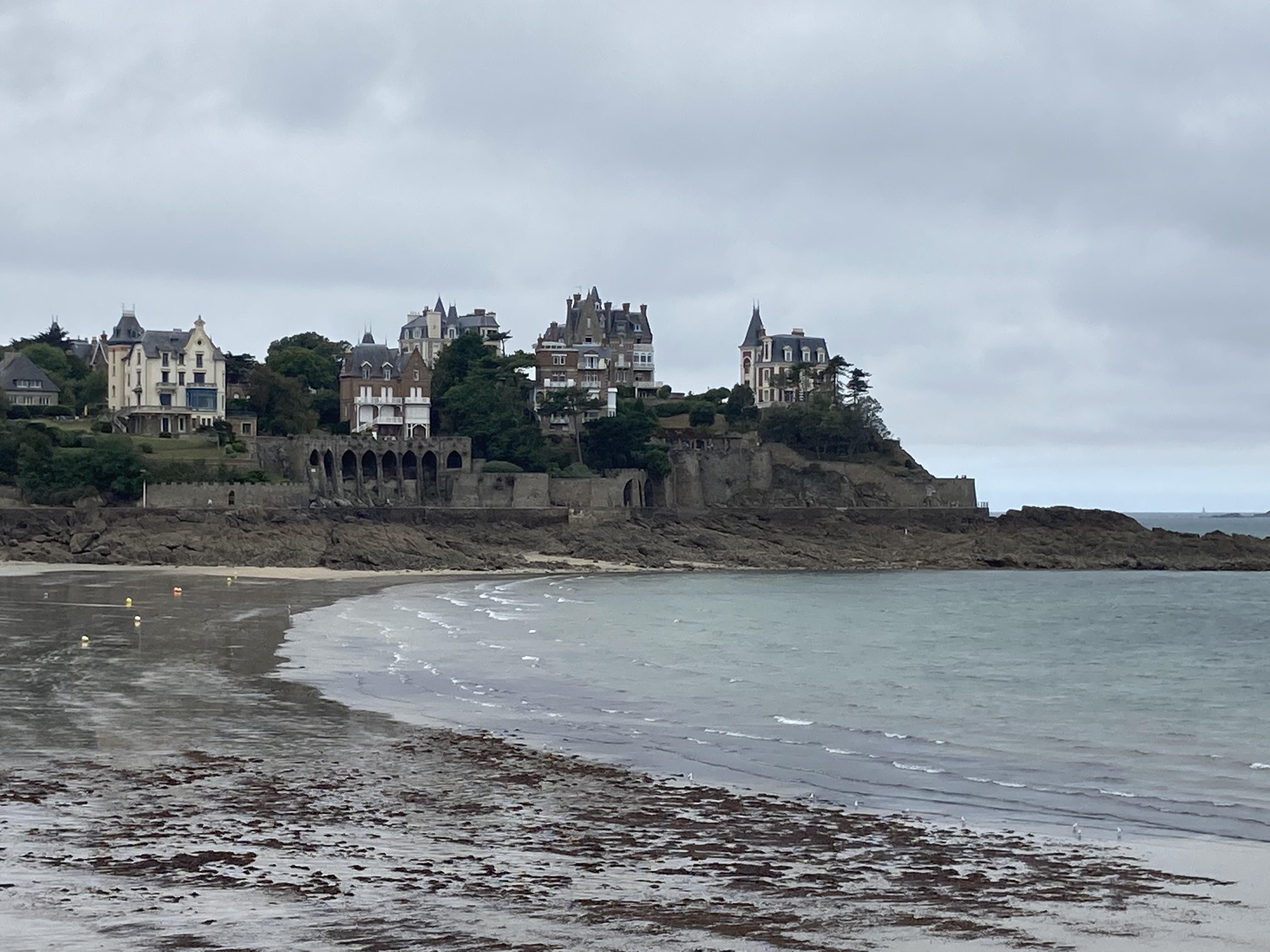 De part et d’autre de la plage de Dinard, sont aménagés des itinéraires bétonnés, sur et aux pieds des rochers, offrant une accessibilité aisée et des vues magnifiques dont nous ne manquons pas de nous ravir… Nous pique-niquons sur un gros rocher, bien attentifs aux mouettes voleuses!