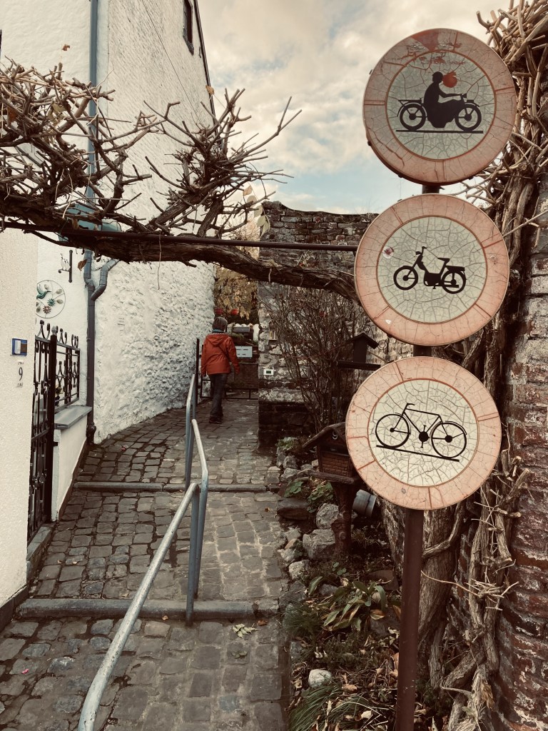 Nous délaissons cette carte postale d’un autre âge et empruntons une venelle où trois signaux d’interdictions de circulation paraissent avertir démesurément toute velléité d’usage autre que piéton…