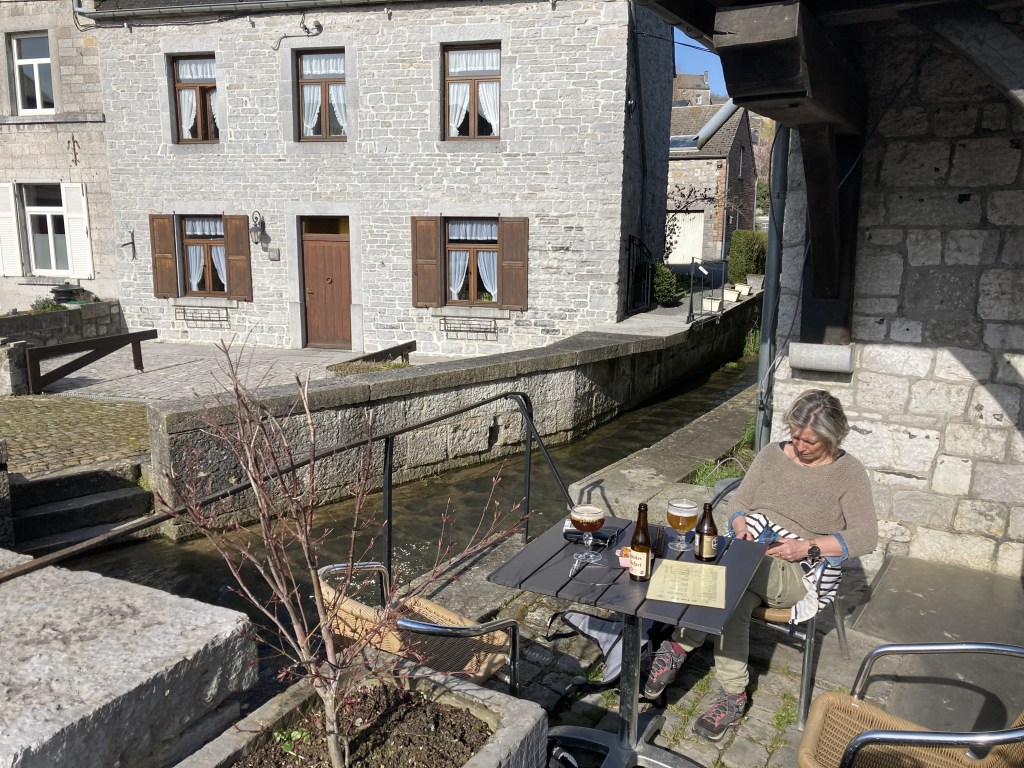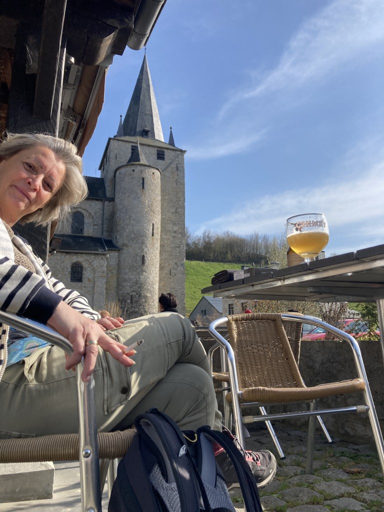 Nous débriefons nos deux bonnes heures de marche (7 km, lunch et flânages compris) à la terrasse de la taverne « Le Val Joli », à quelques mètres de la Collégiale, assis à cinquante centimètres du ruisseau qui fend le coeur du village, sous un soleil généreux…