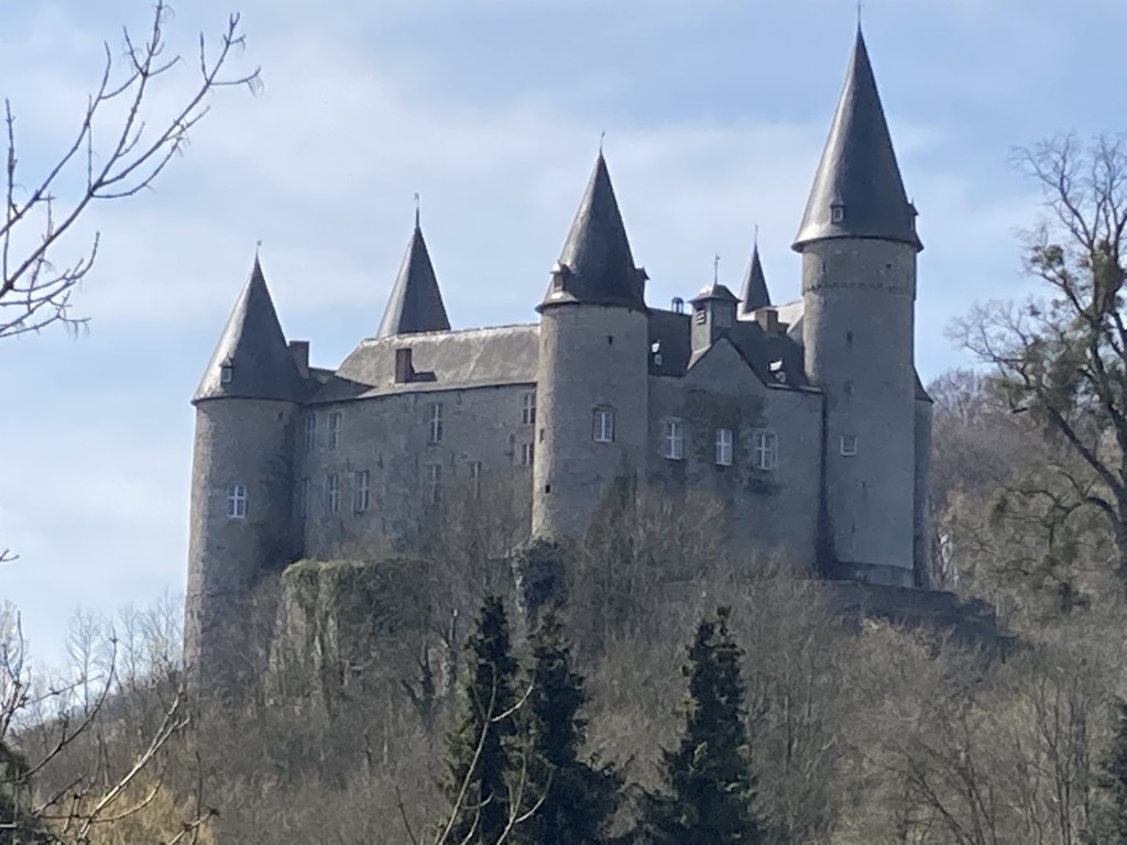 Nous dégustons notre cornet glacé en grimpant la rue de Furfooz, d’où nous admirons le fameux château de Vêves évoquant celui d’Euro Disney de par ses majestueuses tours coniques, parfaitement restaurées au XVIIIème siècle.