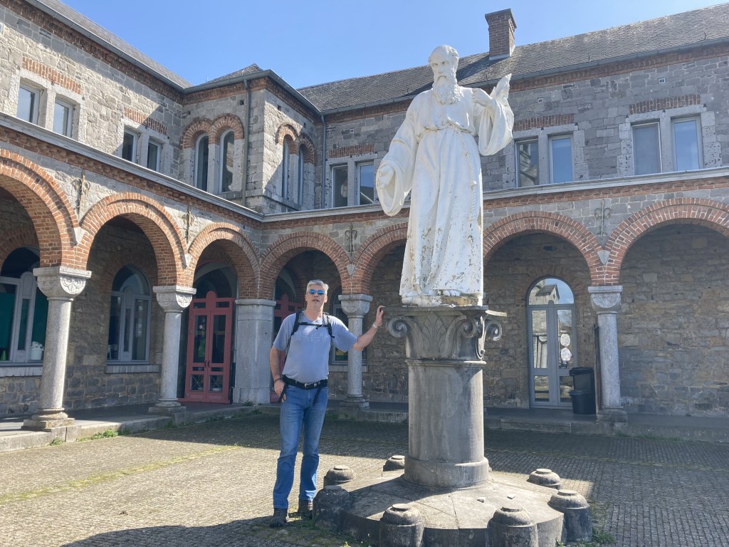La balade débute au pied de la Collégiale millénaire Saint Hadelin (décédé en 692 de notre ère). Une statue toise l’édifice religieux depuis l’Ermitage (accessible via un calvaire en escaliers) au sein duquel une école primaire a élu domicile.