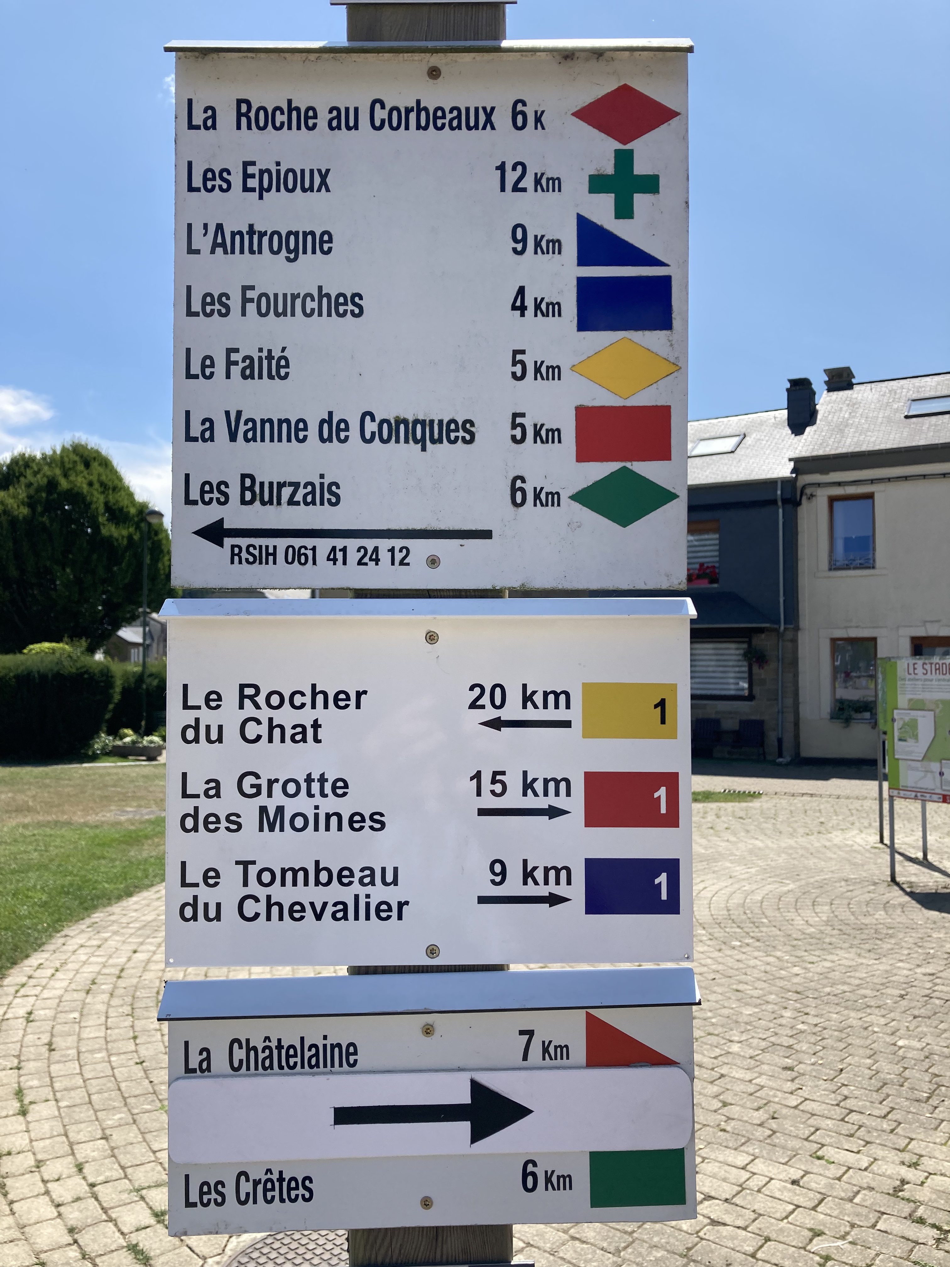 Le choix des randonnées est très étoffé depuis la place du village et depuis le château situé à six-cents mètres de là. Nous constaterons également que les balisages sont très clairs et entretenus, ce qui est une plus-value indéniable. Mes repérages sur le web nous invitent à opter pour la randonné de neuf kilomètres: « Le Tombeau du Chevalier » (particularité topographique), offrant des points de vues tous azimuts sur diverses crêtes autour de la butte du fameux château, en suivant les balises « rectangle bleu/1« .