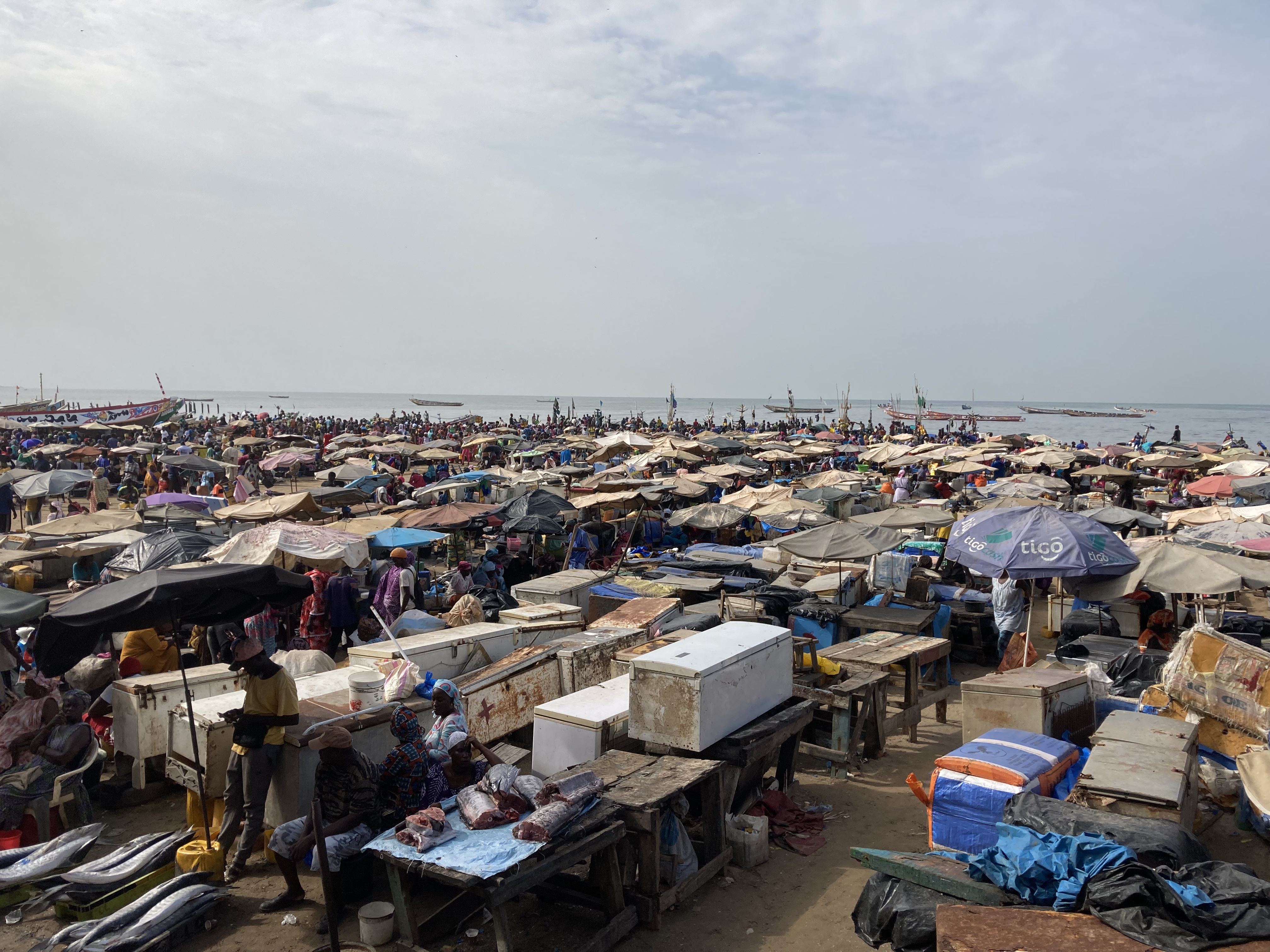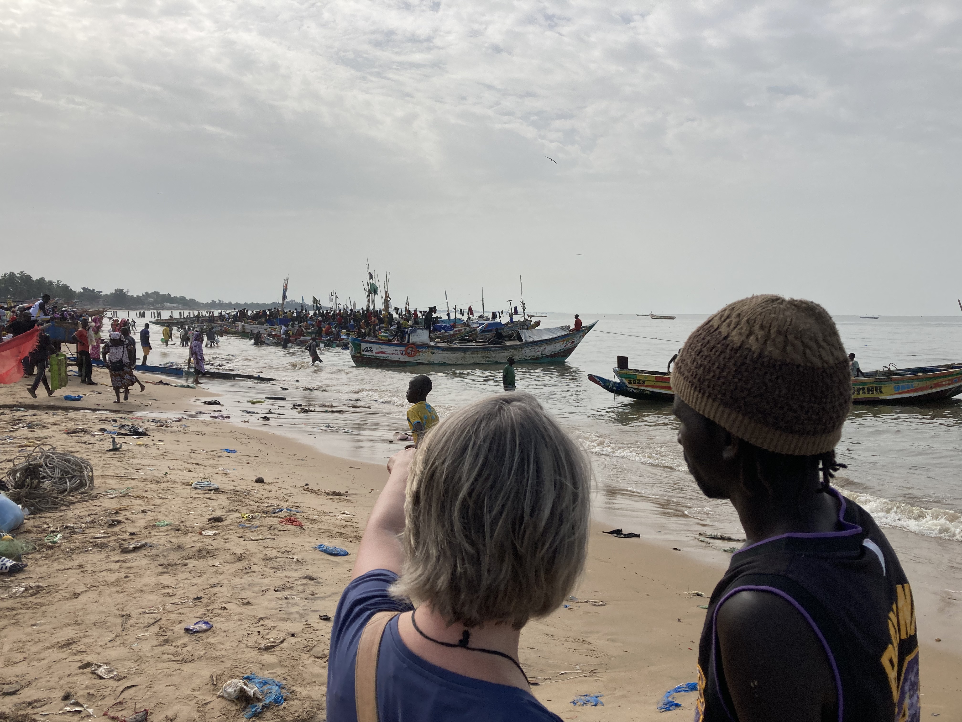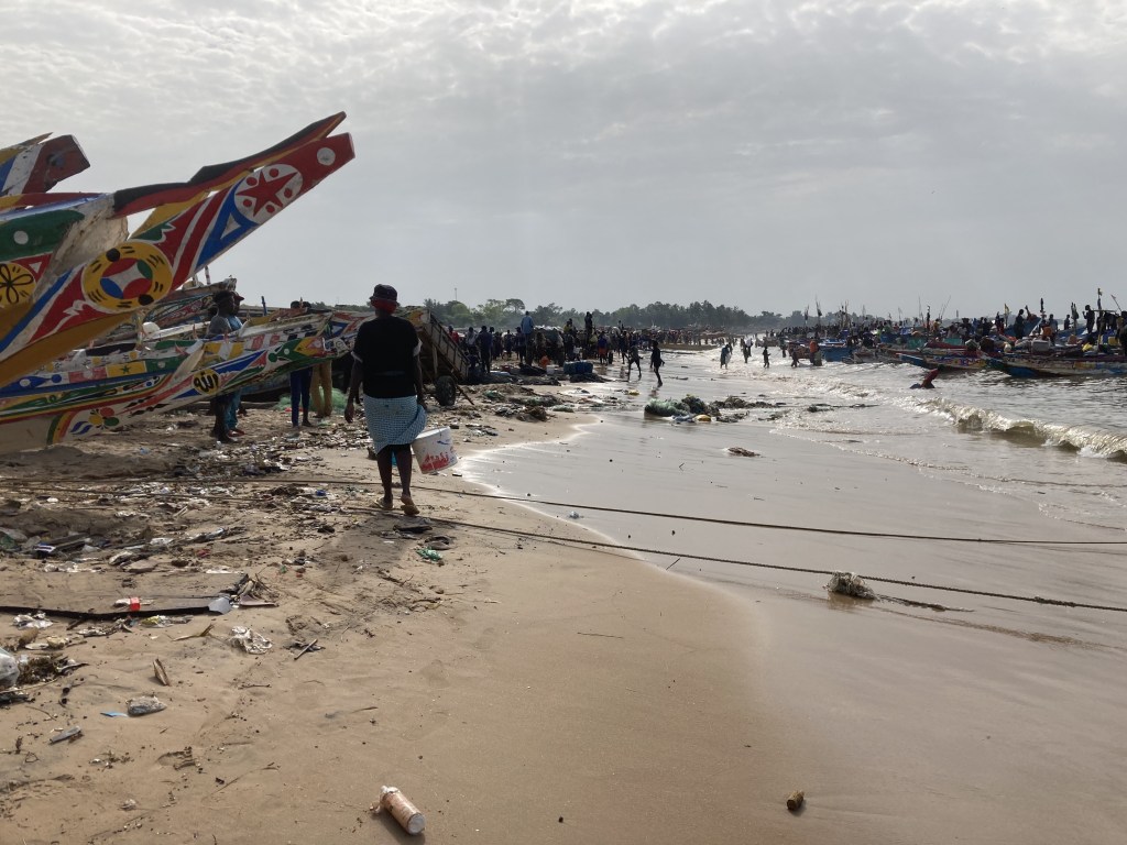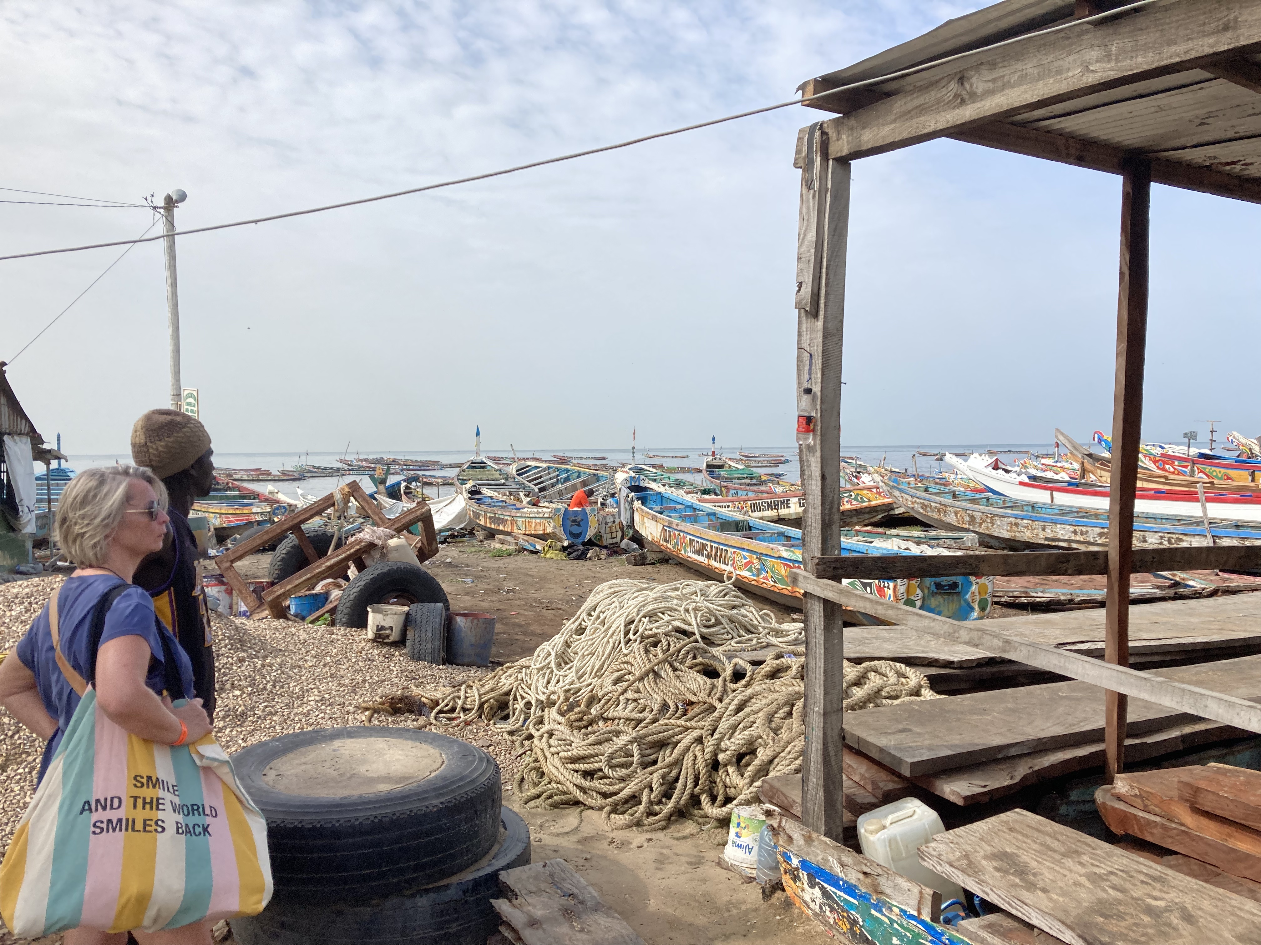 Les centaines de pirogues de divers gabarits augurent une forte fréquentation à M’Bour. Nous accostons sur la plage parmi cette foison d’esquifs et de pêcheurs dont certains nous saluent voire nous hèlent gentiment. Nos bracelets orange fluo « All In » trahissent notre condition mais Abdulaye nous rassure par sa présence qui dissuade toute velléité de commerce de leur part à notre égard.