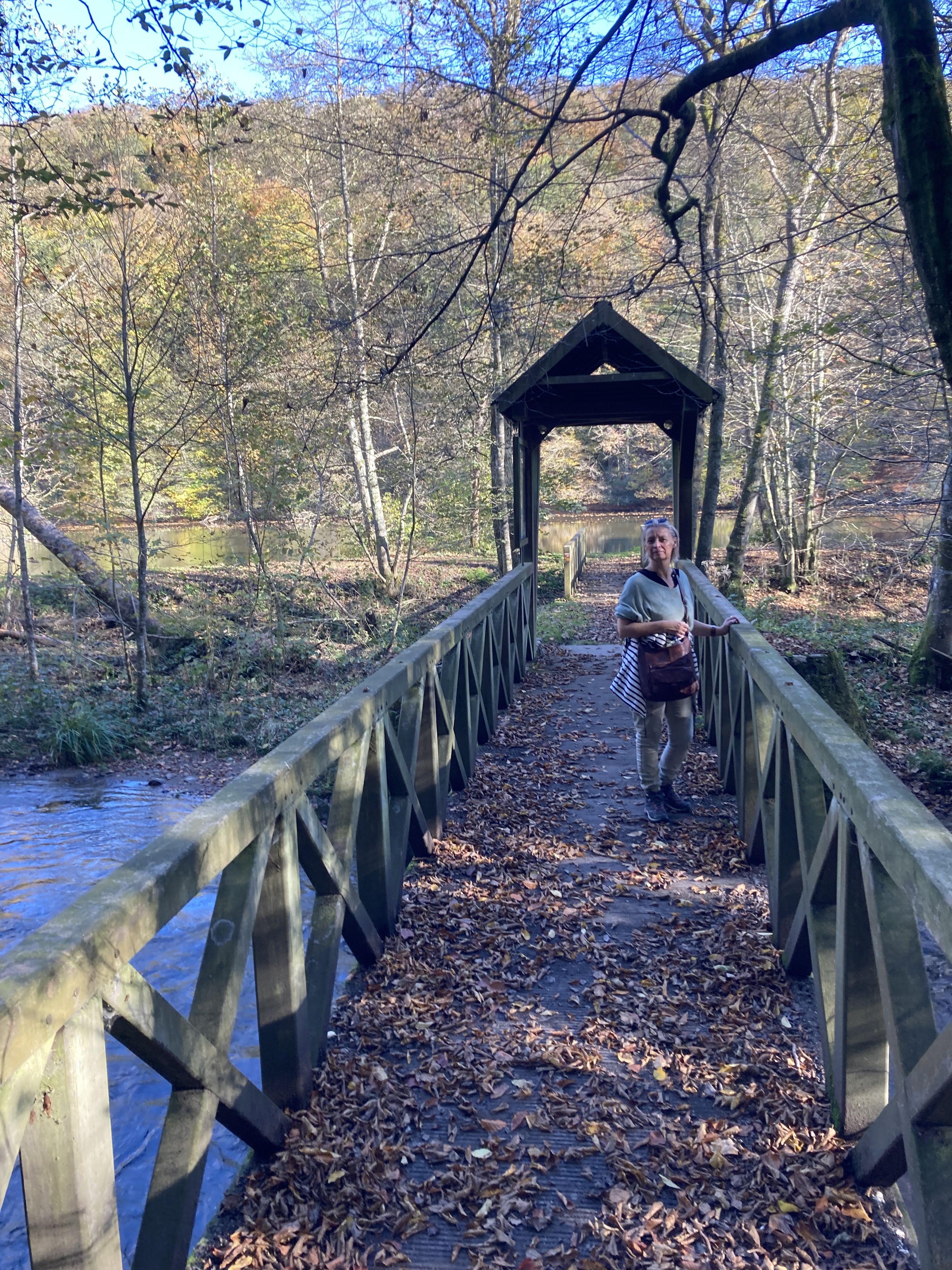 Deux affiches nous alertent clairement sur des chasses en cours dans une partie des forêts, ce qui me laisse penser que nous avons « loupé » une balise. Je m’étais informé la veille à ce sujet et notre balade n’est en principe pas concernée (site DNF région wallonne). Le groupe de néerlandophones qui nous dépasse à pas pressés semble ignorer ces avertissements. Soit, nous rebroussons de trois-cents mètres et apercevons le joli petit pont en bois en contrebas de la route et menant aux « étangs Saint Roch« . Nous retrouvons dès lors une balise « croix bleue« .