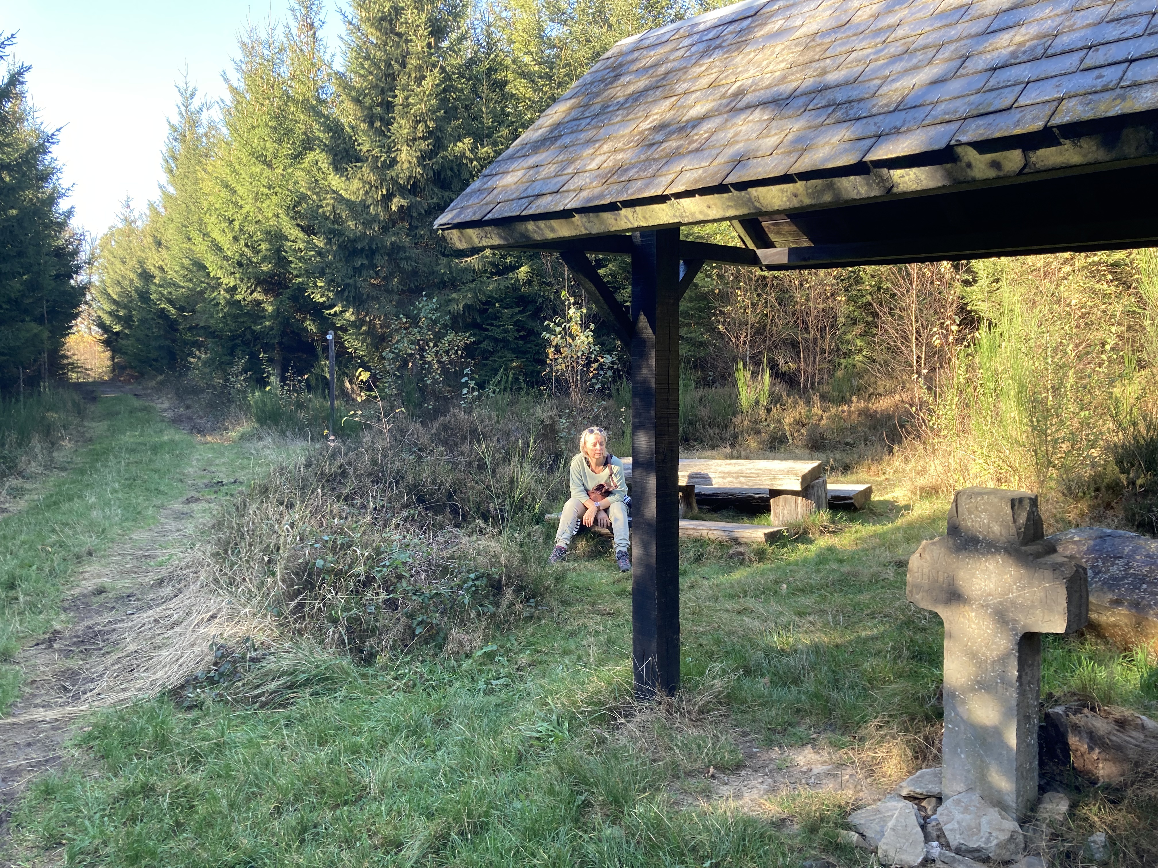 Enfin parvenus sur le plateau forestier, une table et des bancs en bois d’un autre âge nous offrent hospitalité quelques minutes, sous un rai de lumière chatoyant. Un petit préau, récent celui-là (sans doute restauré) abrite une stèle en granit à la mémoire de deux hommes ayant péri à cet endroit en 1773.