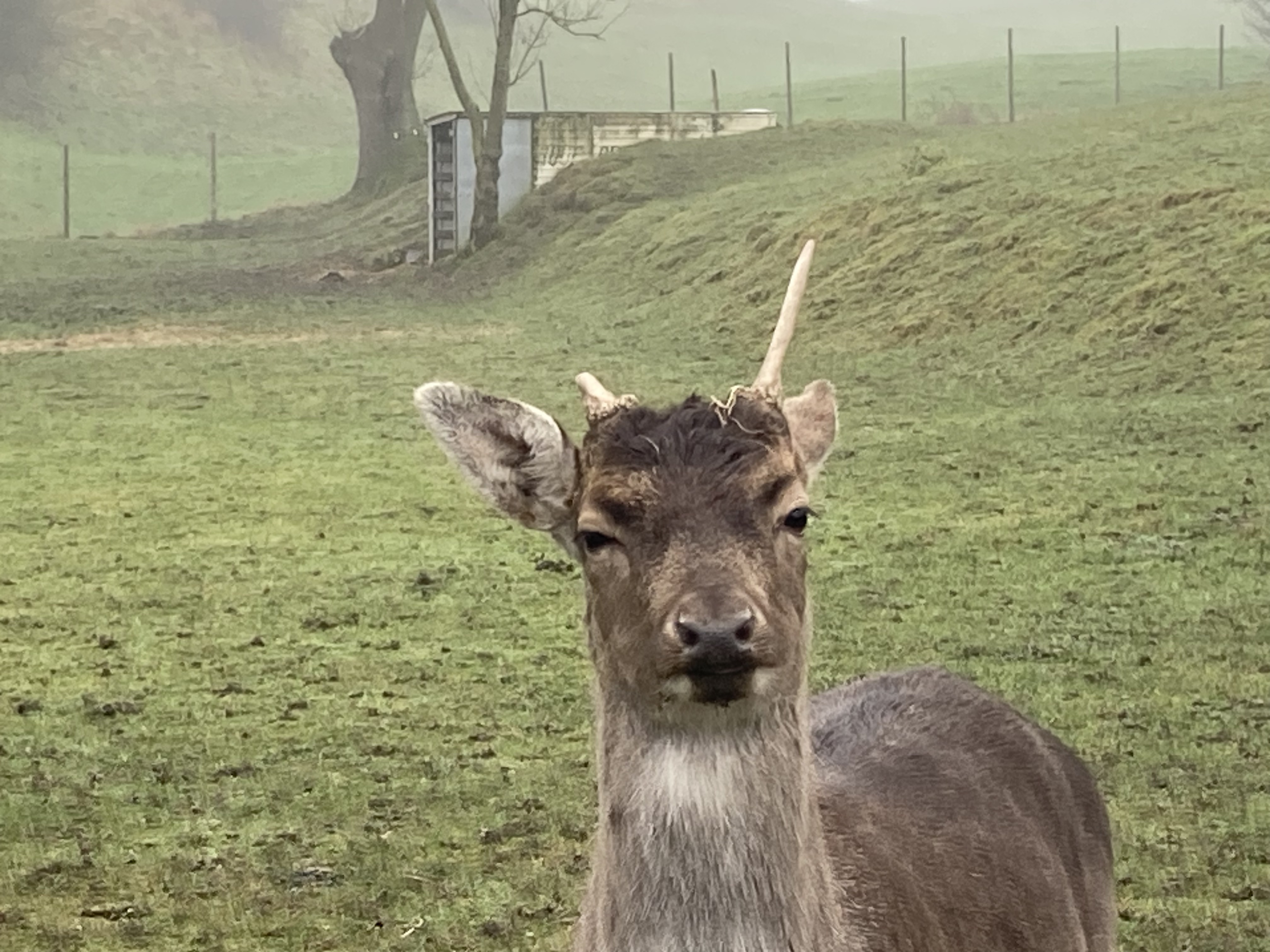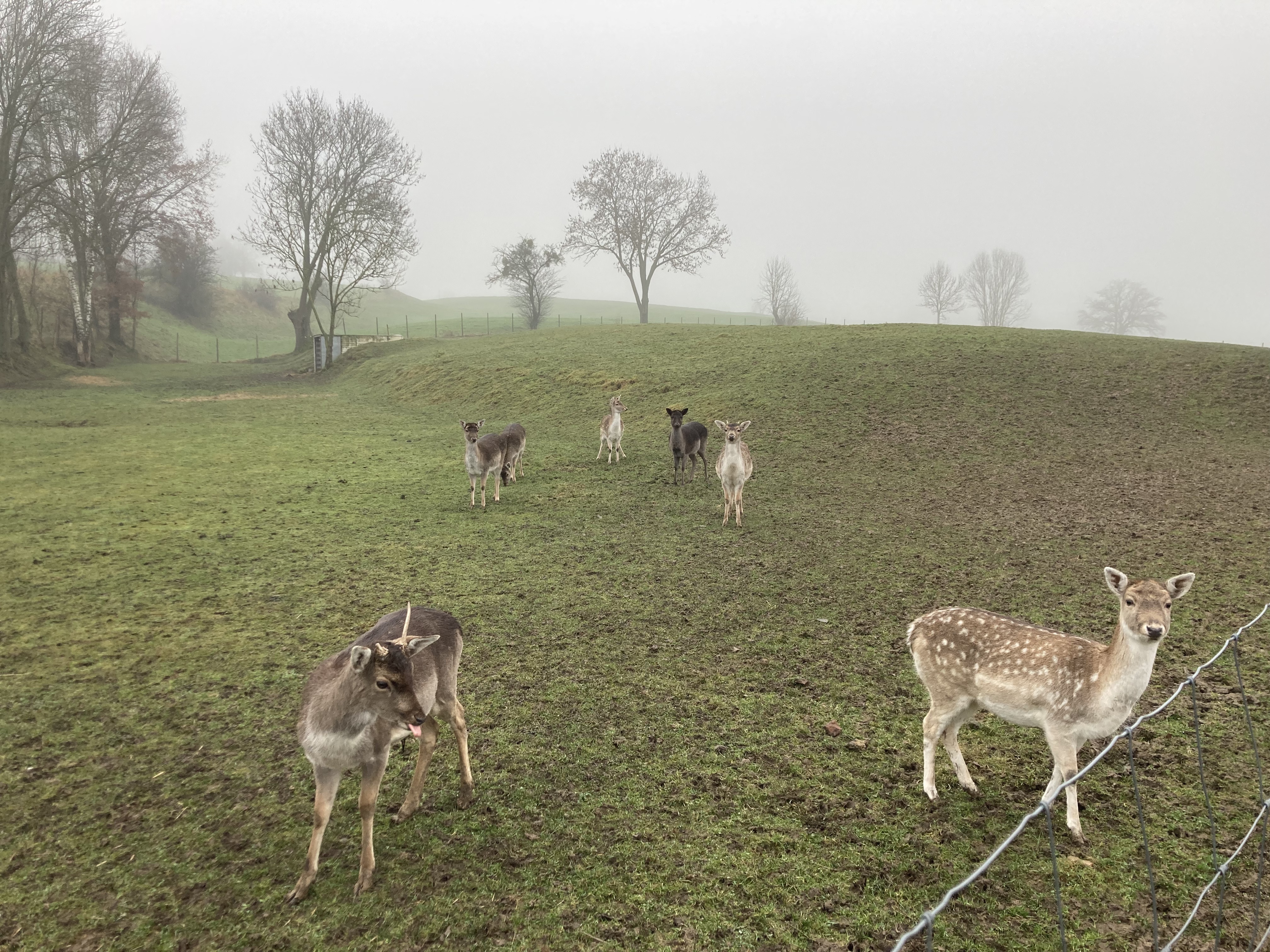 Nous retrouvons des habitations et notre attention est attirée par un groupe de daims nous toisant sans dédain derrière le grillage qui enceint leur pâture. Nous sommes au gîte « Le Terminus » (pouvant héberger au maximum 16 hôtes). Les cervidés, peu farouches, nous font le plaisir de quelques échanges de proximité, ce qui nous ravit… Depuis ce lieu, nous empruntons un ravel dont les rails, vestiges de l’ancienne ligne ferroviaire, demeurent encore, et achevons notre heure et demie de balade bucolique et « brouillardeuse« , terme employé par Laurence qui m’interroge sur sa pertinence de langage.