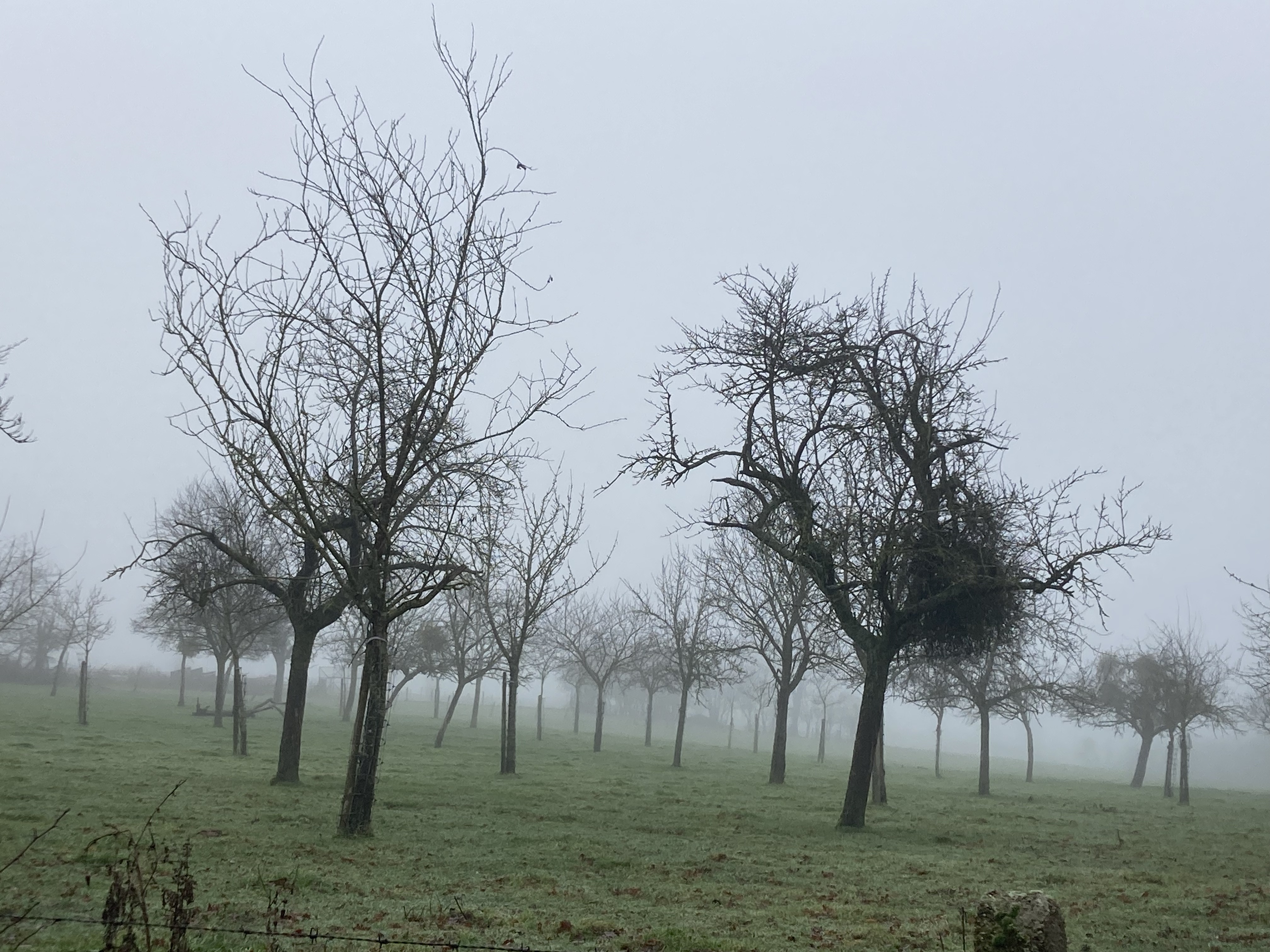 Quittant la zone habitée via un sentiers rendu boueux par les dernières précipitations, nous accédons à une zone agricole. De grands vergers fondus dans le brouillard confèrent à la campagne un air quelque peu lugubre mais à la fois poétique.