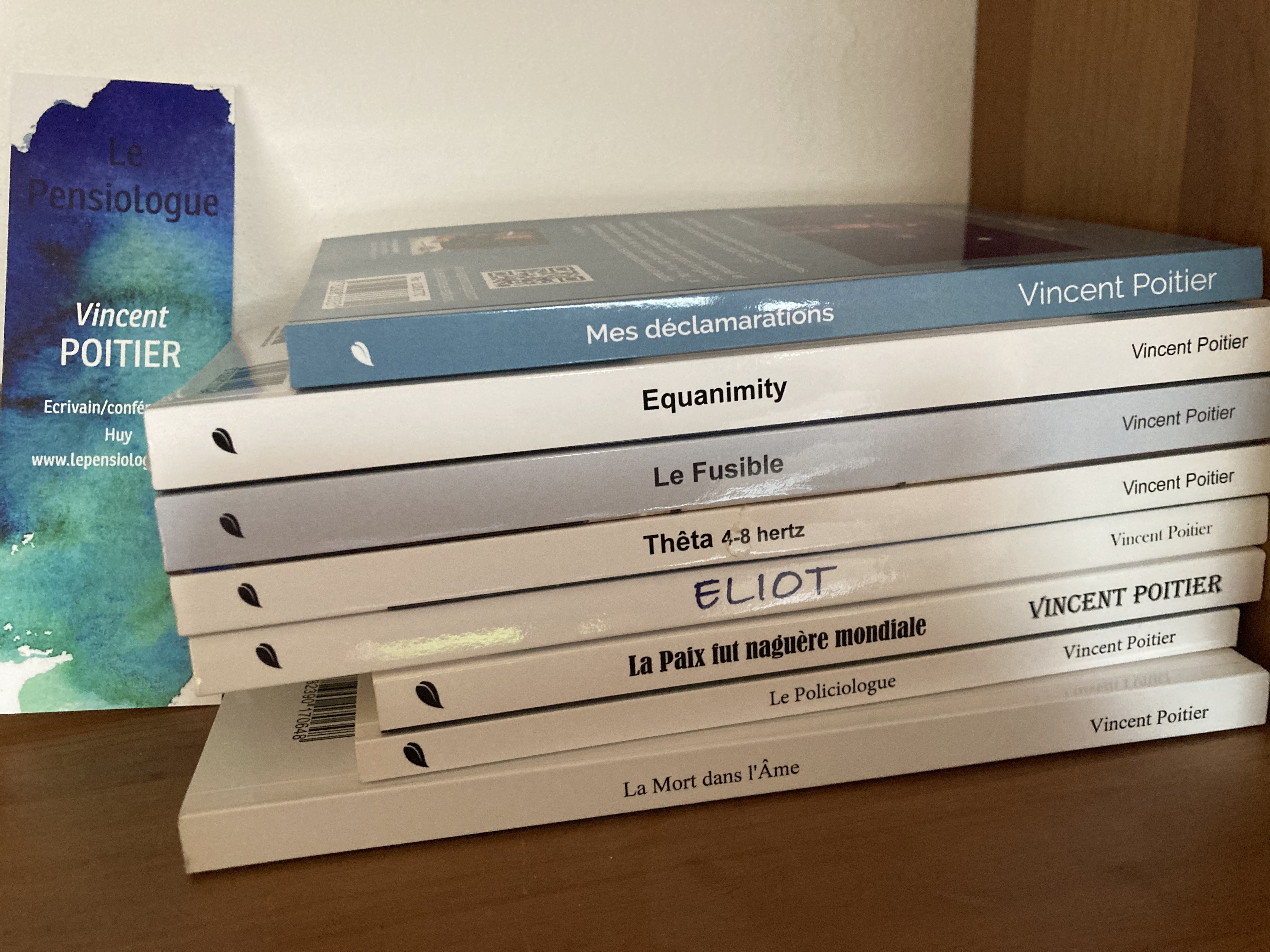 J’ai écrit trois essais publiés ainsi que quatre romans intitulés « ELIOT » et « Thêta 4-8 hertz », « Le Fusible » et « Equanimity » , de même qu’un recueil de textes et slams « Mes déclamarations » (cf pages concernées dans les menus principaux).